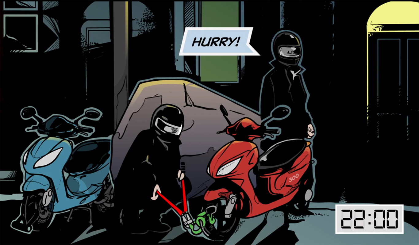 De hecho, en las imágenes muestran una animación en la que dejan un claro ejemplo de la moto a la que acceden, que básicamente es aquella que utiliza sistemas antirrobo muy básicos o fáciles de romper o cortar, sin bloqueo de la dirección y que tampoco está cubierta con una funda protectora. Al final del vídeo, resumen esto de forma básica con la frase ''Bloquea, encadena y cubre tu scooter''.