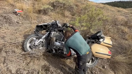 Ahí está lo complicado del vídeo. Digamos que el vídeo pinta bien, hasta que la pendiente puede con la Gold Wing y la acaba prejubilando antes de tiempo, digamos. Los restos de ella, carrocería, intermitentes, altavoces y muchas más piezas, terminan desperdigados por la colina. El manillar doblado, y el motor herido de muerte.
