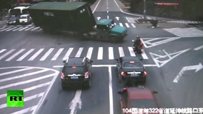 Pongámonos en situación: nuestro personaje está parado en una intersección regulada por semáforos en China. Justo en ese momento un camión de gran tonelaje gira a demasiada velocidad y vuelca. Pero el conductor de la moto, que debe tener reflejos de ninja o algo parecido, se percata del accidente y rema con sus piernas hacia atrás para evitar que el camión le caiga encima y lo aplaste. ¿Sangre fría, reflejos, suerte? Táchese lo que no proceda. Lo que si que es cierto es que el tipo salva el pellejo por centímetros.
