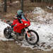 Poco a poco se va metiendo en faena con la Panigale V4, ascendiendo por el escarpado monte, que no solo estaba lleno de caminos pedregosos, también por lugares helados, lo que complicó aún más la ascensión en la moto deportiva.