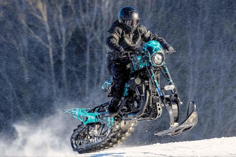 El resultado lo puedes ver en forma de esta ex-Sportster, una moto a la que despojaron de su rueda delantera para montar un patín articulado sobre la horquilla invertida para darle dirección al conjunto y una parte trasera donde desaparece el basculante original y se ha incrustado una oruga de moto de nieve con suspensión y frenos incorporados.