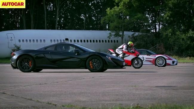 Las carreras de aceleración entre coches y motos suelen poblar Youtube, pero pocas veces nos encontramos con comparativas tan exclusivas como ésta que han llevado a cabo los amigos británicos de Autocar. No digo exclusiva por el tipo de carrera sino por los participantes. Por un lado tenemos dos coches de los que no se ven mucho precisamente: McLaren P1 y Porsche 918 Spyder. Dos superdeportivos híbridos que rondan los 900 caballos de potencia combinada.