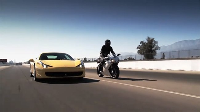 Parece ser que sí, vaya que si puede. Tanto en el cuarto de milla como en el circuito habilitado la Ducati ha sido mucho más rápida que el Ferrari. En la recta típica americana cuando la 1198S pasa por meta ha llegado a superar por poco los 233km/h mientras que el deportivo acaba de pasar de los 200km/h, es decir, una diferencia de 1.1 segundos en el cronómetro. En el circuito, donde supuestamente la ventaja se debe reducir hasta emparejarlos, nos llevamos una sorpresa al comprobar que nuevamente la moto bate al coche, en este caso superándolo por casi 2 segundos.