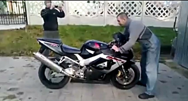 Pues imaginaos lo que tiene que ser “coger el toro por los cuernos” y aguantar la potencia de esta CBR 900 Fireblade con la gran dificultad de tener los mandos al contrario de cómo están habitualmente. Seguramente el mayor inconveniente sea soltar el embrague lo suficiente y de la manera adecuada, pero continuando con la misma presión en ambos manillares para que la dirección no se cierre. Pero claro aquí al amigo cabeza de buque polaco se le acumula el trabajo y en décimas de segundo se ve arrastrado por el morlaco.