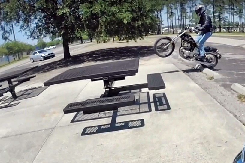 Más o menos la teoría se la sabe el protagonista de nuestro siguiente vídeo. Un aspirante a stuntman que a lomos de su Honda Rebel 250 (vale, ya sólo con ver la moto sabemos que no es un especialista tomando decisiones) y ayudado por un pequeño bordillo practica sus trucos. Animado por los dos compañeros de las cámaras repite la maniobra, pero la finaliza de manera totalmente abrupta contra una mesa de metal.