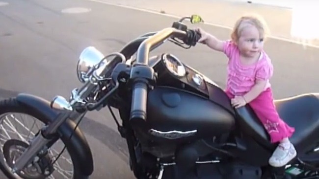 A vosotros no se, pero a mi se me pone cara de felicidad al ver a esta pequeñaja encaramándose a la moto de su padre y el gesto que tiene cuando arranca la Harley-Davidson de papá y le da al gas. Sólo puedo imaginarme lo mejor para ella cuando tenga la edad, y la estatura suficiente, para llegar al suelo y a los mandos de una moto. Seguramente este vídeo es el del nacimiento de una motera.