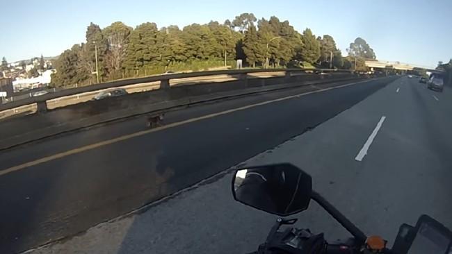 En este caso el conductor de una moto (una KTM por más señas) va conduciendo por una autopista tan tranquilamente. Al momento se da cuenta de que hay un perro corriendo en medio del tráfico. Casi antes de que podamos verlo en las imágenes de la cámara. Rebasa un par de coches que parece que han tenido un accidente, e inicia la persecución del atemorizado animal para intentar rescatarlo.