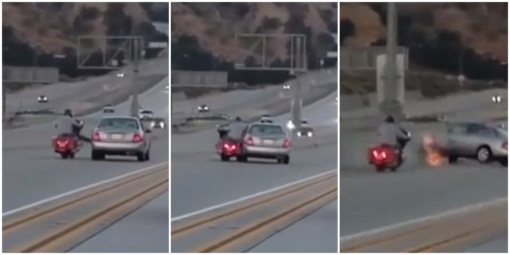 Contrariamente, el conductor del sedán es el mayor perjudicado de todo el enfrentamiento y viéndose superado por las leyes de la física. Ante el severo volantazo el conductor pierde el control del coche que acaba chocando frontalmente con la mediana, destrozando su coche y lanzando metralla contra el motorista y volviendo por inercia a la marcha, sin ningún control. O eso, o el motorista es Chuck Norris y le ha metido una patada que ha descompuesto por completo al coche.