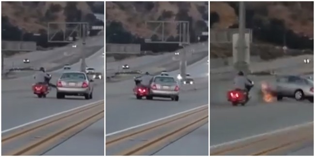 Sí, efectivamente. Mejor míralo otra vez no vaya a ser que te hayas perdido algún detalle de la jugada. Ante la agresión de roja directa del motero, el automovilista reacciona aún más violentamente, pegando un volantazo para intentar derribar a la motocicleta. Por suerte, el gran volumen y masa de lo que parece una Harley-Davidson impiden que el motorista pierda el control y se mantenga en pie aunque llega a tocar contra la mediana de hormigón.