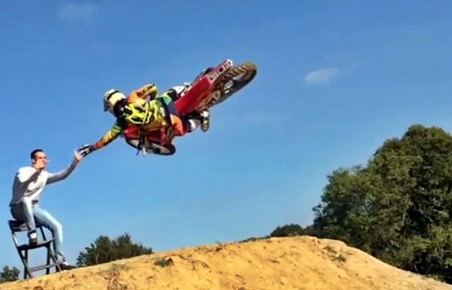 Lo primero de todo es poner a todo un profesional del motocross como Valentin Teillet a los mandos de su Honda y luego colocar estratégicamente a un amiguete. De grabar el vídeo que se encargue otro para eliminar la peligrosidad de los selfies y si además le añadimos cámara lenta el resultado es tan espectacular como el que sigue.