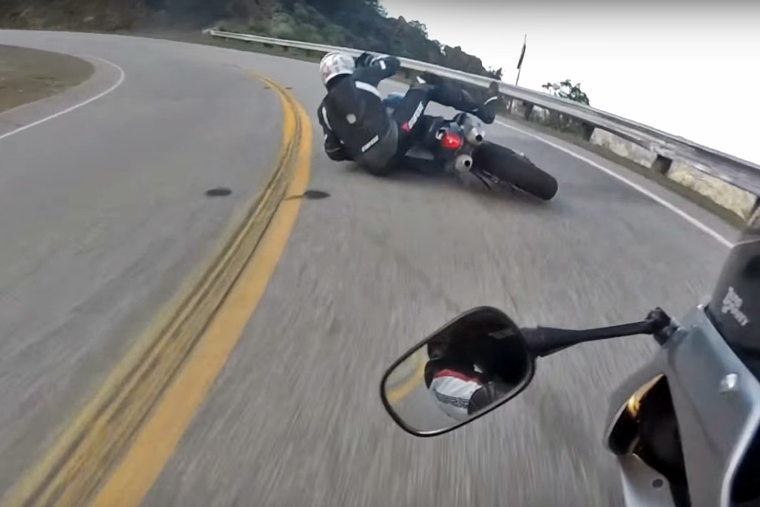 En este caso, la KTM Duke II que encabeza el grupo pierde adherencia al entrar en la curva, y la Honda CBR 1000 RR que le sigue instintivamente frena en plena inclinación y también se va al suelo. El resultado es una aparatosa caída a poca velocidad en la que los pilotos salen casi ilesos y las motos se han hecho íntimas. Pero podría haber sido peor, porque el tercero en discordia va bastante pegado a su vez a la segunda moto y pudo salvarse de la caída por los pelos.