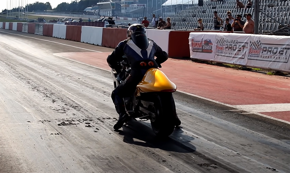 La unidad de la japonesa dispone de una par de infarto, incluso para ser una moto eléctrica, lo que provoca que en uno de los intentos el piloto prácticamente no consiga mantener la rueda delantera en el suelo durante los primeros metros. Eso no le impide marcar un tiempo de 10.056 segundos y poner al conjunto de 164 kg de peso a 322 km/h.