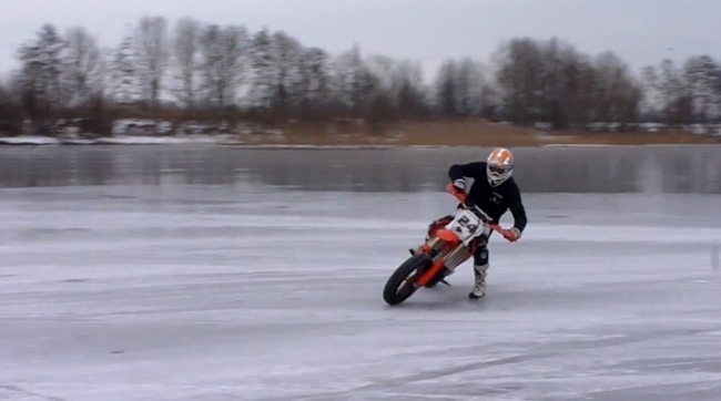 Si vives en una región fría y te gustan las motos puedes hacer dos cosas: amargarte a lo bestia o disfrutar como un enano. Jurgen van den Goorbergh, experimentado piloto que supera de largo los cuarenta años y que os sonará a más de uno, cuando llega el invierno sale a hacerle la competencia al gordo barbudo a Papá Noel sobre un pequeño lago helado cercano a su domicilio.