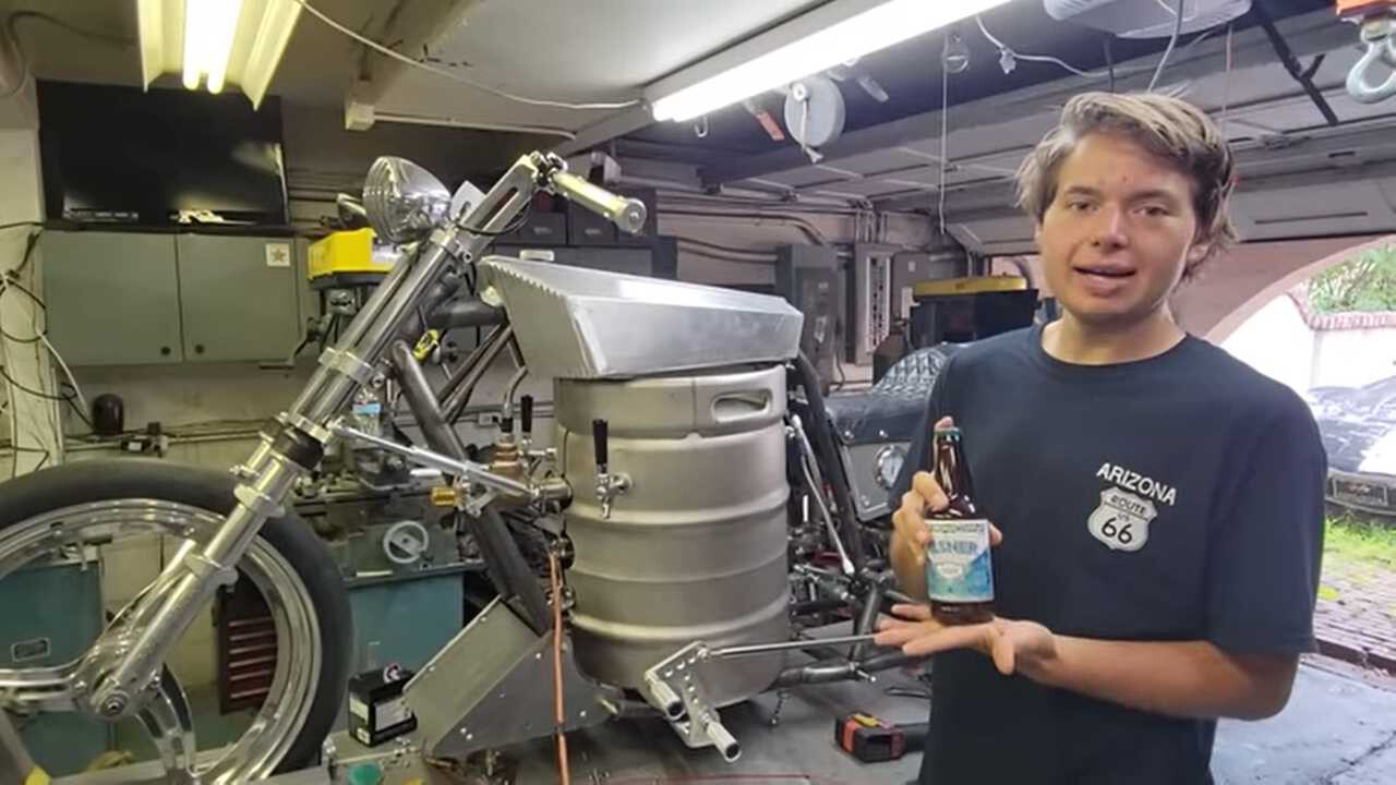 Pues en los últimos años ha estado metido en el pequeño garaje de su casa trabajando en esta particular moto junto con su hijo Buddy. Construida de cero y con unas estilizadas líneas, en vez de equipar un motor de combustión, lo que hizo fue montar un barril de 52 litros de capacidad. El objetivo era que la moto funcionase con cerveza.