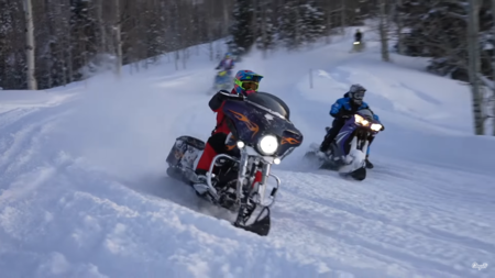También gozaron de un poco de 'hill-climb' o subida de montaña, pero en una Harley-Davidson preparada para la nieve por las montañas de Wyoming. Si ya son difíciles para los vehículos normales, imagina para esta pesada bestia. El cómo sale, mejor te dejamos que lo veas por ti mismo, pero es un espectáculo digno de disfrute.