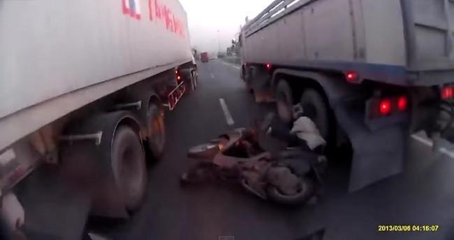 Creo que una de las mayores locuras que se puede hacer en una moto es intentar colarte entre dos camiones. Hay muchas posibilidades de que si algo falla, acabes debajo de uno de estos mastodontes de múltiples ruedas y gran tonelaje. Pero a veces, a uno la suerte le sonríe y se acaba levantando con el miedo en el cuerpo pero sin un rasguño.