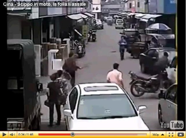 Impresionante video el grabado el pasado 19 de mayo cuando dos ladrones que circulaban en moto por un barrio comercial en China deciden “dar el tirón” a una mujer que en esos momentos caminaba por la calle con su bolso. Lejos de lograr su propósito sin complicación, tras los gritos de ayuda de la mujer se organiza una pequeña persecución, empezando a salir gente de todos los rincones del barrio.