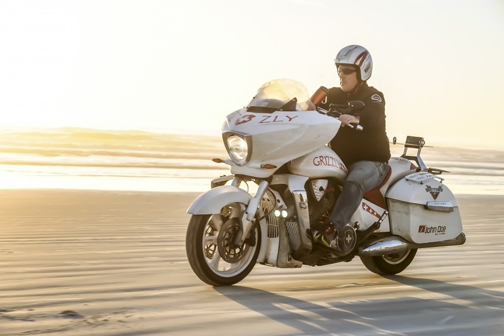 Sea de la manera que sea, en este caso Urs Pedraita, conocido como Grisu Grizzly, un vecino suizo, se está preparando para dar la vuelta al mundo sobre su Victory Cross Country intentando batir el récord que quedó establecido en 120 días y dos horas por Kevin y Julia Sanders. Urs quiere dejarlo en "solo" 100 días.