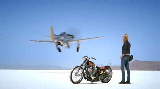 Breitling es una marca de relojes asociada al mundo de la aviación y de la competición de vela, pero en el mundo del motor se la asocia más a las carreras de resistencia de coches que a las motos. Con este panorama era de esperar que cuando a aparezca una moto en su publicidad no salga demasiado bien parada. Aunque si la comparación es con un North American Mustang P-51D casi cualquier moto sale perdiendo, porque estamos hablando del Cadillac del cielo ¿Recordáis la escena de El imperio del sol cuando Jaimie los ve dar una pasada sobre el campo de concentración? Además de esa piel de aluminio pulido en sus entrañas escondía un moto uve 12 Packard V-1650 de 27 litros capaz de alcanzar los 1.500 CV y 703 km/h a 7.620 m sobre el nivel del mar.