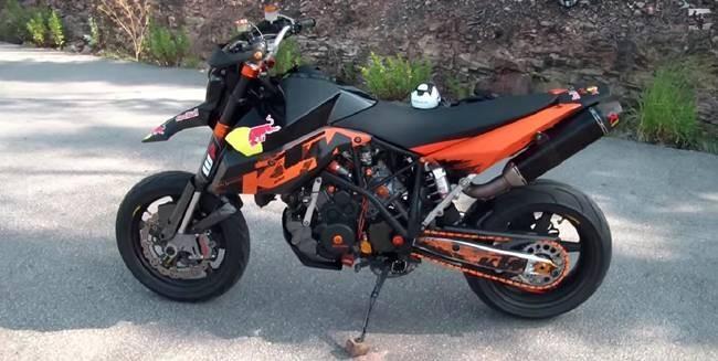 Esto es lo que se le ha ocurrido al siguiente chiflado, no sé si alemán o austriaco portugués, que ha trasplantado el motor de una RC8R en el corazón de una 990 (ya no) Supermoto. Por si fuera poco, el motor ha sido preparado por PCV, cuenta con un escape completo Akrapovic en carbono con colectores en titanio, quickshifter, llantas de carbono Dymag, discos Braking, bomba y pinzas Brembo y como él mismo dice, mucho titanio y fibra de carbono.