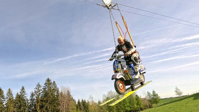 Sustituyeron el teleférico de la pista de esquí vacía en Höhenhart (Ried im Innkreis), por la Vespa Red Bull PK 50 del austriaco. Luego la sujetaron con unos arneses desde la parte frontal y trasera y se subió encima para tirarse. Al ritmo de 'Jump Around', unos segundos después de tirarse en plancha ya tenía otro récord mundial certificado.