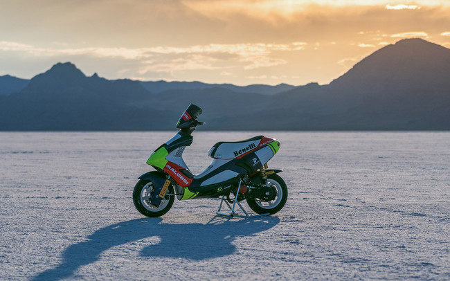 Con el objetivo en mente de batir el récord de velocidad desde parado con scooters de 50, 85 y 100 centímetros cúbicos, Malossi junto a Pirelli preparó algunas Benelli para grabar su nombre en el Libro Guinness de los Récords en el desierto más famoso de América: Boneville.