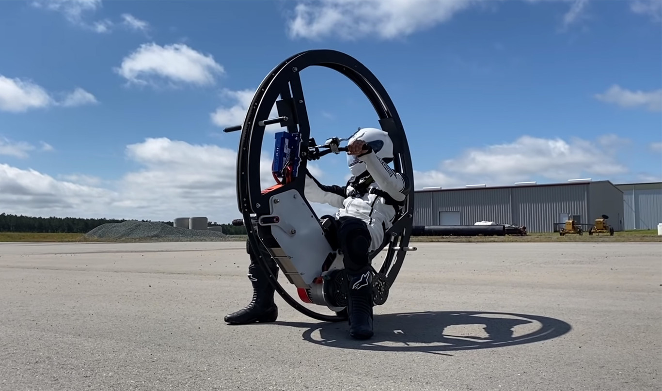 Esta enorme rueda con manillar de moto y asiento se muestra bastante inestable a la hora de su conducción, como queda claro en las imágenes. No nos queremos ni imaginar lo que puede ser ir a más de 100 km/h subido en este monociclo.