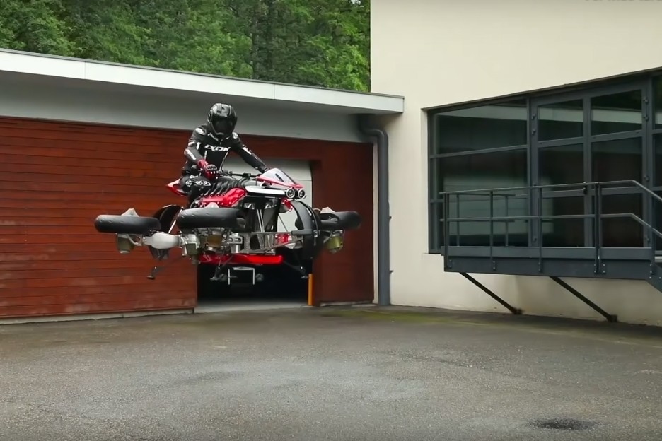 Parece que Ludovic ha evolucionado el prototipo hasta ser lo suficientemente estable para que su piloto se atreva a volar el artefacto fuera de una nave y junto a un garaje, con coche aparcado incluido. Bueno, quien dice volar, dice mantener en el aire y en la misma posición la moto voladora durante menos de diez segundos para acabar aterrizándola.