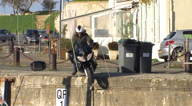 ¡Uuuyyyyyyy!¡casi! Faltó poco para conseguirlo. Lolo, intentando esquivar los obstáculos que encontraba en su camino a la gloria golpea una de las maletas y se va directo al mar. Él cae en un velero sin aparentes daños más que la certeza de haber dejado para el arrastre toda una Yamaha FJR1300 cedida por la marca. Diría que casi consigue subir también la máquina, aunque viendo el tremendo impacto de la touring nipona contra el suelo apostaría que habría hundido la embarcación.