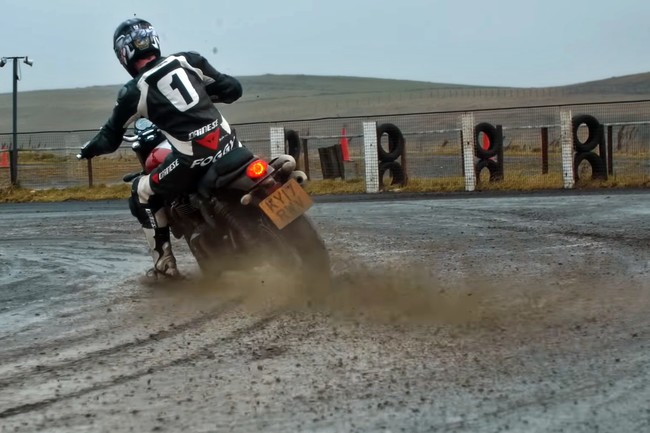 Neumáticos de carretera, suspensiones de serie, pista encharcada y un tiempo propio de las islas británicas, el día perfecto para ver a Foggy de nuevo sobre una moto.
