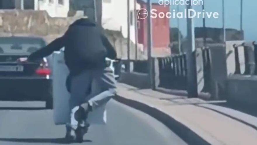 Fue grabado por el pasajero de un vehículo mientras conducía el patinete por una de las calles de Ceuta. Un vídeo que por lo bizarro de la situación ya lleva más de 630.000 reproducciones en la cuenta de SocialDrive en Twitter y que consecuentemente ha revolucionado las redes sociales.