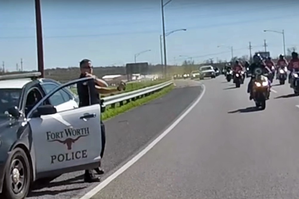 Por algún motivo, el agente de la policía de Texas da el alto a una enorme pick up y ambos vehículos se paran en el arcén de la autovía. Desde la cámara podemos ver cómo el grupo de motos pasa a una distancia razonable del coche, pero por algún motivo el policía la considera insuficiente (por buscar algún razonamiento en su cabeza) y según se baja del coche patrulla ya lleva el espray reglamentario desenfundado y comienza a rociar a los motoristas.