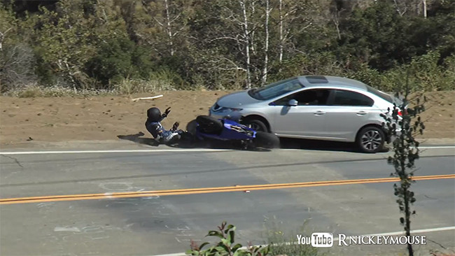 Si volvéis a ver el vídeo, notaréis como ya hay un primer turismo que consigue evitar el atropello frontal y lateral con la rueda trasera. Para cuando el piloto llega a la altura del Honda Civic, ambos han conseguido aminorar la velocidad. Uno tirando de frenos, el otro gracias a la fuerza de rozamiento con el asfalto. Es, por cierto, la caída número 87 que registra un único usuario con una cámara… algo está fallando.