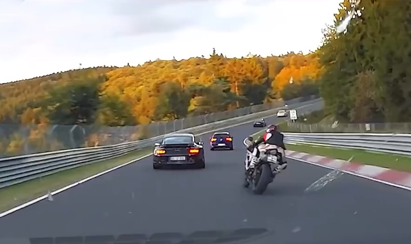 Tener un Porsche Cayman GT4 y vivir cerca de Nürburgring solo puede tener ventajas. Te compras un pase anual y puedes entrar prácticamente todas las semanas de la temporada a rodar. Y a veces te encuentras con inesperados rivales, como las motos.
