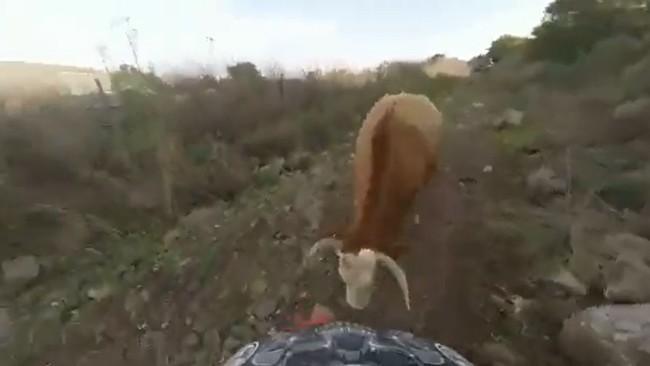 No hace tanto que publicamos un par de vídeos en los que un elefante decidía que por delante de el no debía pasar ninguna moto ni nada que a el no le gustase. Probablemente ese elefante fuera familia del carnero que ya conocimos hace un tiempo. Lo que no sabíamos es que ambos tienen un pariente en común, una vaca a la que tampoco le gustan las motos.