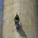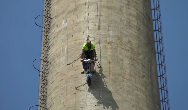 Para el último truco, el especialista se ha sacado de la chistera el de recorrer los 110 metros cuesta abajo de una chimenea empresarial a lomos de su Vespa. Más concretamente, la chimenea de una empresa abandonada en Pezinok, Eslovaquia, que ya ha sido utilizada infinitas veces como plataforma para hacer puenting pues es una de las estructuras más altas para hacerlo sin "peligro".