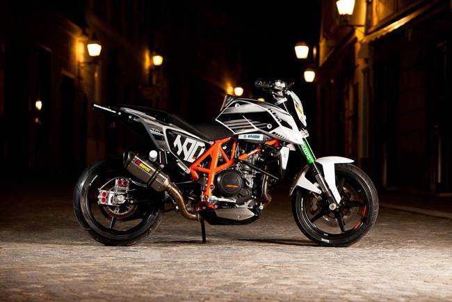 Las especificaciones de esta KTM 690 Duke que yo he denominado 'stunt style' las podéis ver a continuación: * 70 caballos * 160 kilos con el tanque lleno * Doble freno trasero Magura * Escape tipo slip on Akrapovič * Topes anti caídas, barra para wheelies realizada por KTM * Neumáticos blandos radiales Sava * Corona trasera de 52 dientes * Superficies adherentes repartidas por toda la moto