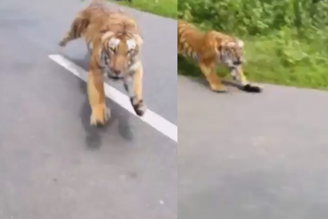 En el vídeo, colgado en el Instagram de @Wayanadan se ve cómo están los dos guardas circulando en lo que parece un scooter por una vía asfaltada. El pasajero graba uno de los laterales de la carretera para comprobar si llegan a captar alguna imagen del tigre. Cuál es su sopresa cuando no solo ven al dulce animalito, sino que en cuestión de pocos segundos acelera hasta casi cazar a los dos ocupantes de la moto. El conductor consigue acelerar lo suficiente para escapar del ataque de la fiera.