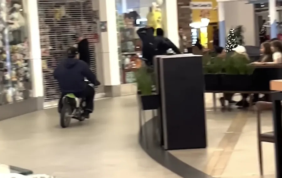 Estos tres chavales entraron con sus motos en un centro comercial en Santa Clarita, en California. Iban en dos motos y causaron auténtico pánico entre los clientes del lugar.