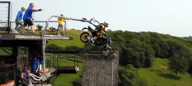 Por eso tirarse desde un puente del viaducto de la Souleuvre subido a lomos de una Honda Hornet no tiene ningún sentido, es más, básicamente es absurdo. Pero simplemente por el espíritu creativo de la idea y el valor de llevarla a la práctica seguramente se tengan ganado el respeto de muchos de sus lectores. Además no solo os traemos a continuación el vídeo del salto. También podemos ver el vídeo de cómo se hizo, sin lugar a dudas muy interesante.