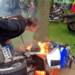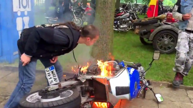 Lo que no esperaba nuestro amigo es que la moto acabase en llamas, o quizá si. Bueno, seguro que no, porque cuando esta empieza a arder, sus "colegas" le ayudan a apagar el incendio tirándole el contenido de los vasos que están bebiendo. ¿A que temperatura arde el Vodka? Pero lo mejor está todavía por llegar, cuando nuestro amigo ve que el fuego no se apaga, decide tomar cartas en el asunto y empieza a soplar las llamas como si se tratase de una vela de cumpleaños. Pasen y vean una nueva especie de reventador de motos.