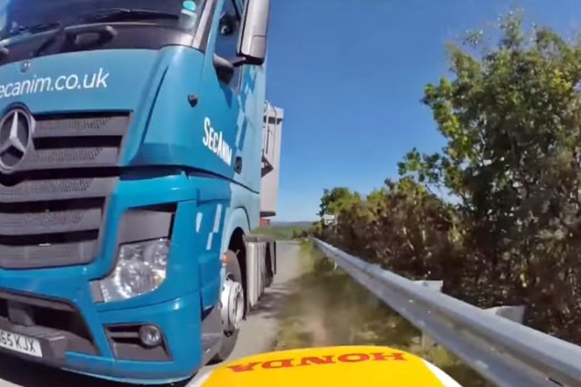 Por suerte, al menos nuestro "piloto" tuvo reflejos, redujo la velocidad todo lo que pudo y se lanzó directo hacia la única opción que tenía de salvar la tragedia: tirarse al borde de la carretera. La precisión de la maniobra parece de especialista de cine, pasando a milímetros del camión y del quitamiedos, salvando la caída por la hierba y volviendo a la carretera después de un salto de bordillo al llegar a un puente que cruzaba sobre la autovía.