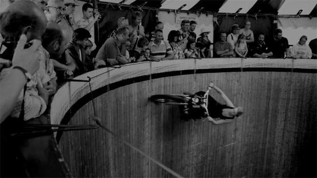 Debe hacer siglos que no piso una feria de atracciones, pero en mi descargo he de decir que en ninguna de las ferias que montan por la zona donde vivo se incluye una atracción como esta de The Wall of Death, porque si así fuera seguro que me dejaría unos cuantos euros disfrutando de las acrobacias que se pueden ver en ella. La suerte que tenemos es que Benedict Campbell vio el espectáculo de Ken Fox cuando era niño y ahora, unos cuantos años después, ha realizado este interesantisimo cortometraje con una realización más que cuidada.