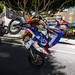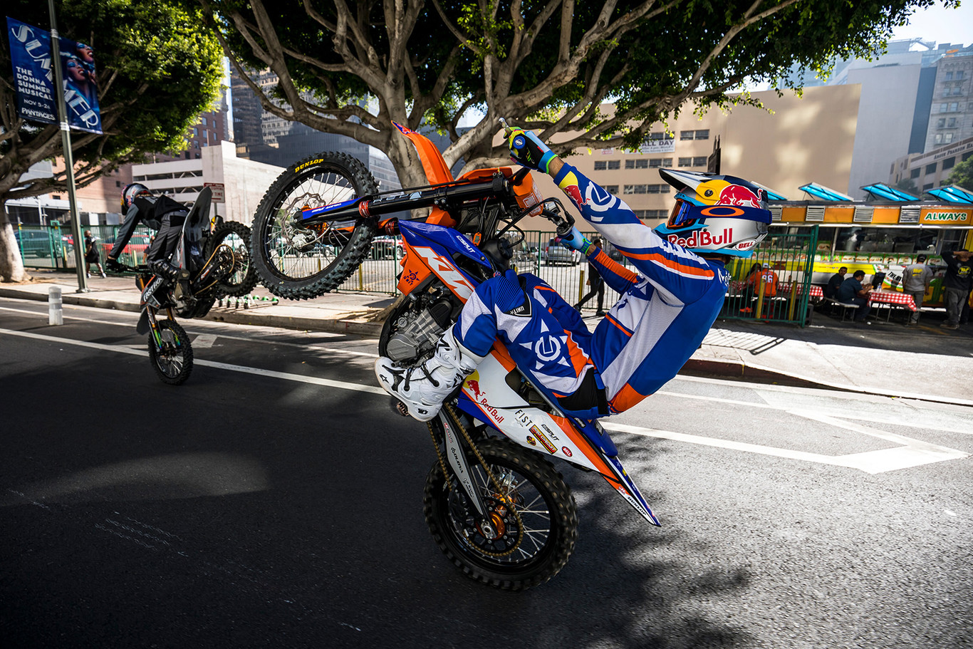 No pasa mucho tiempo hasta que podemos ver a los pilotos haciendo de las suyas y poniendo al límite las KTM de competición con las que prácticamente no respetan ninguna de las normas de tráfico. Bueno, en realidad sí, cuando el agente de policía les dice que no pueden pasar por una calle y amablemente se bajan de los vehículos de dos ruedas para atajar por medio de las salas del Ayuntamiento de Los Ángeles.