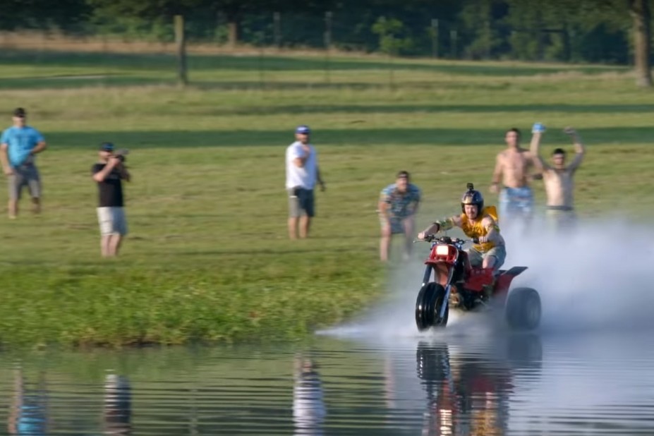 Acto seguido y tras intentarlo Travis Pastrana, que llega a la otra orilla tras pegarse el golpe de su vida, quien se puso realmente en serio fue Trevor Piranha, un tipo de Maryland (Estados Unidos) al que le encanta la cerveza, con su viejo triciclo Honda 250R de dos tiempos. Lo intenta siete veces y en todas acaba hundiéndose. Milagrosamente consigue revivir el motor tras sacar litros de agua. La octava carrera es la épica, la que habían soñado todos ese día. Consigue por fin cruzar de lado a lado el lago y Piranha lo celebra, cómo no, con una cerveza.
