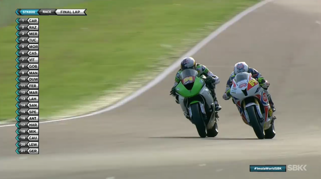 A decir verdad, las carreras de Superbike en Imola del pasado fin de semana fueron de todo menos entretenidas, salvando, eso sí, la de Supersport. No obstante y, aunque no salen en las televisiones nacionales o internacionales, la categoría de Superstock 600 ofreció un auténtico show a los espectadores allí desplazados. Lo que veréis a continuación es una lucha cuerpo a cuerpo, y tan limpia como un quirófano, entre dos pilotos igualmente motivados por la victoria.