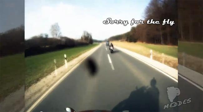 En un primer visionado del vídeo no me di cuanta de que el campo en el que aterriza la moto está algo así como un metro por debajo del nivel de la carretera, con lo que además de la salida también hay un aterrizaje en tierra. No se ve el velocímetro pero no hace falta para apreciar que el conductor se despacha a gusto con el gas para completar tres adelantamientos del tirón, una moto, una furgoneta y un coche antes de que la carretera gire. No quiero imaginarme el accidente si la carretera hubiese tenido un guardarraíl junto con su exceso de velocidad.