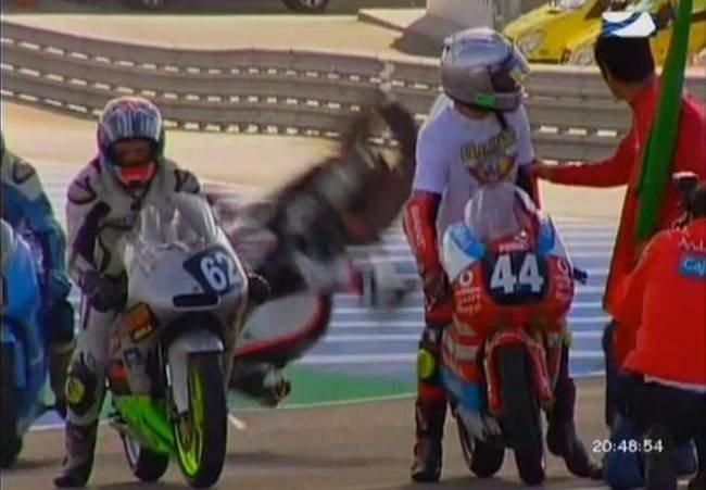 Así es como podríamos definir lo que ocurrió durante la celebración del título de Campeón de España de 125cc por parte de Maverick Viñales y de la victoria de carrera de Miguel Oliveira. El joven piloto portugués se encontraba celebrando el triunfo en la última prueba cuando vió como la moto de Johnny Rossell golpeaba a uno de sus compañeros.