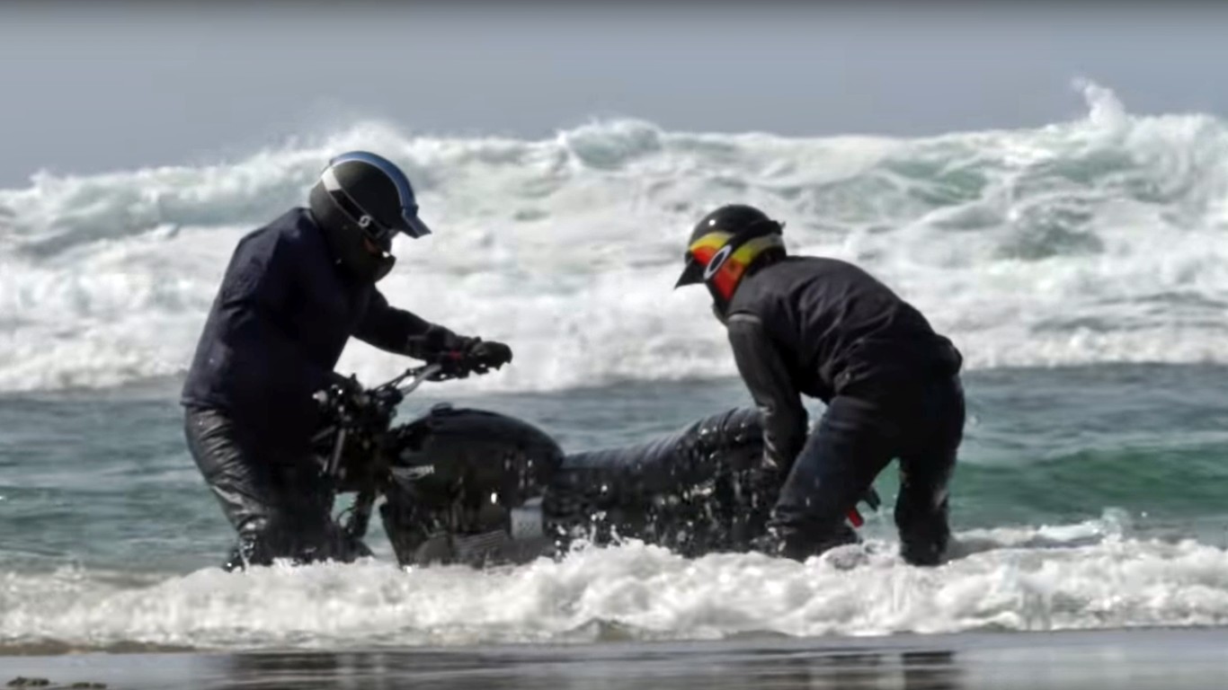 En esta ocasión el dúo, después de rodar por la ciudad y el bosque, se trasladó hasta una idílica playa con la arena perfecta para hacer unas tomas espectaculares. Todo bien hasta que los juegos con el agua no acabaron bien y Ernie Vigil no pudo evitar que su Street Scrambler cayera bajo las olas.