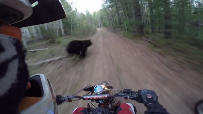 En el vídeo que os traigo hoy un par de endureros van a buen ritmo por un camino en medio de uno de esos enormes bosques que hablábamos antes, y como el que no quiere le cosa por delante de ellos cruza un oso corriendo a toda velocidad. Esto que nos podría parecer anecdótico podría haber acabado bastante peor que acabó el accidente del camión atropellando una Ducati Monster o que el tipo que asalta a una pareja motera por filtrarse en el tráfico. Más que nada porque el oso puede acabar "merendándose" a los de las motos y a ver cómo le haces entrar en razón.